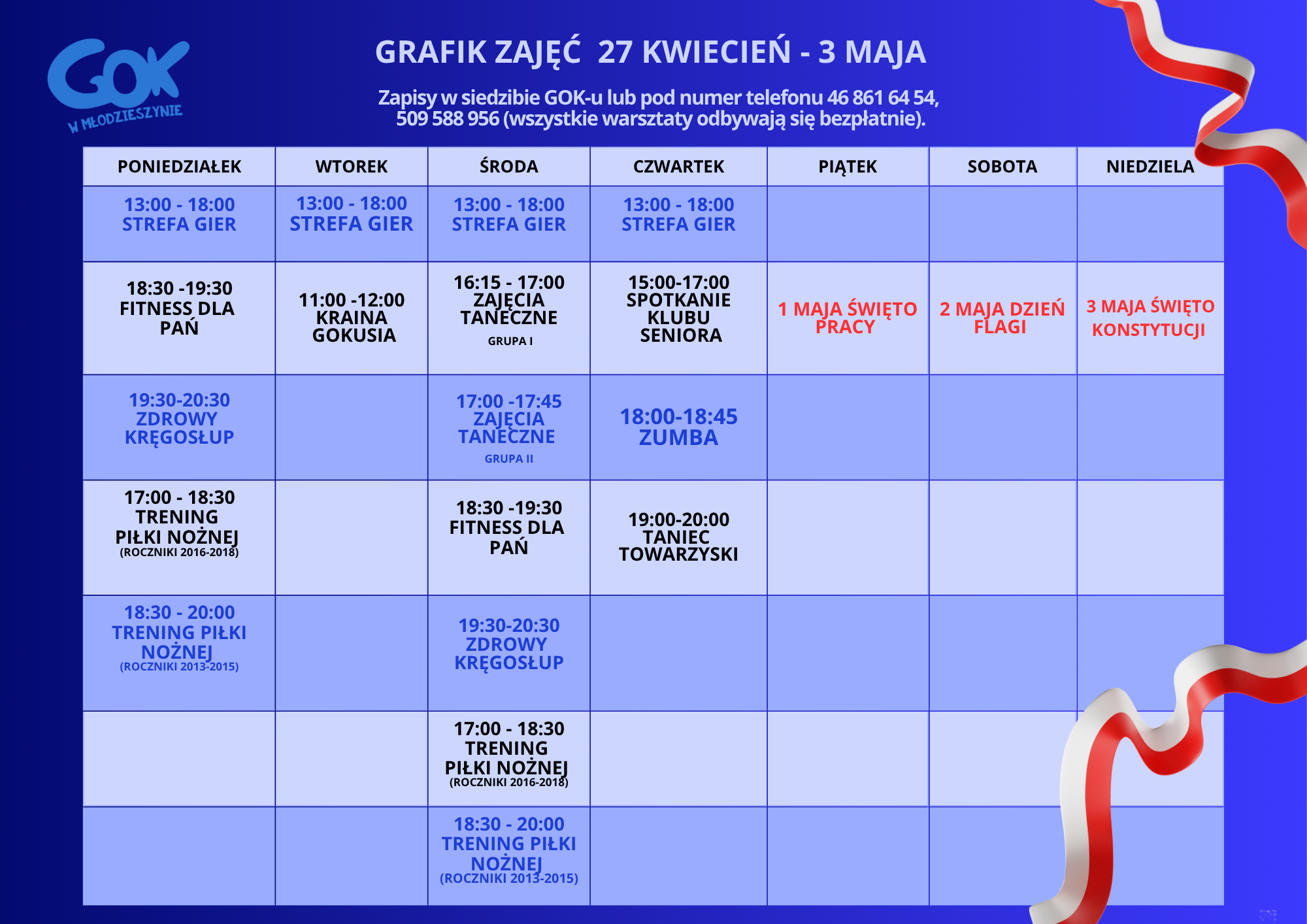 Zajęcia odbywają się w godzinach 16:00–17:30 w Gminnym Ośrodku Kultury w Młodzieszynie.