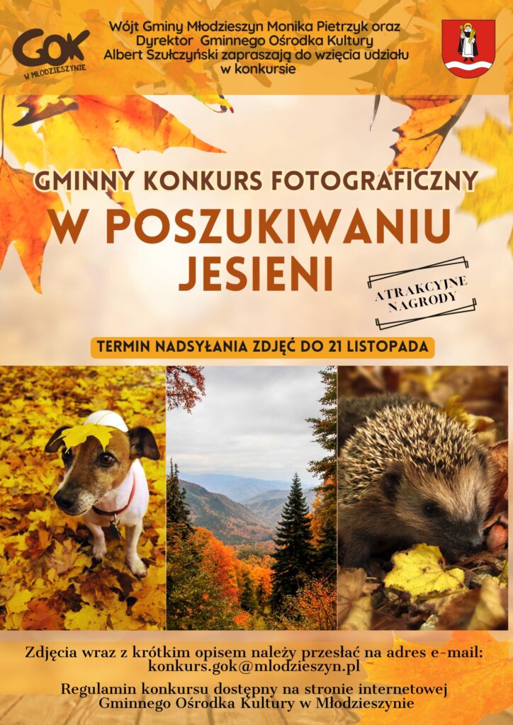 🍂Gminny Ośrodek Kultury w Młodzieszynie wraz z Wójt Moniką Pietrzyk  zapraszają do udziału w konkursie fotograficznym „W POSZUKIWANIU JESIENI„.🍁