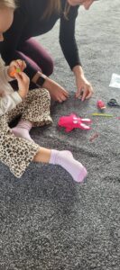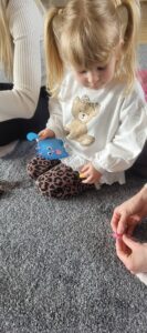 Po niej przeszliśmy do kolejnego zadania. Dzieci, przy wsparciu swoich mam, wyszywały własne maskotkowe breloczki .